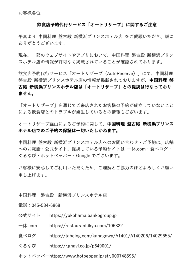 飲食店予約代行サービス「オートリザーブ」に関するご注意 | 当店との予約提携はございません