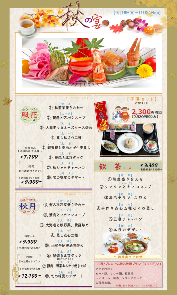 お祝いコース料理ばんこでんプリンスホテル中国料理個室季節限定懐石料理接待料理新横浜新横浜プリンスホテル盤古殿秋顔合わせ